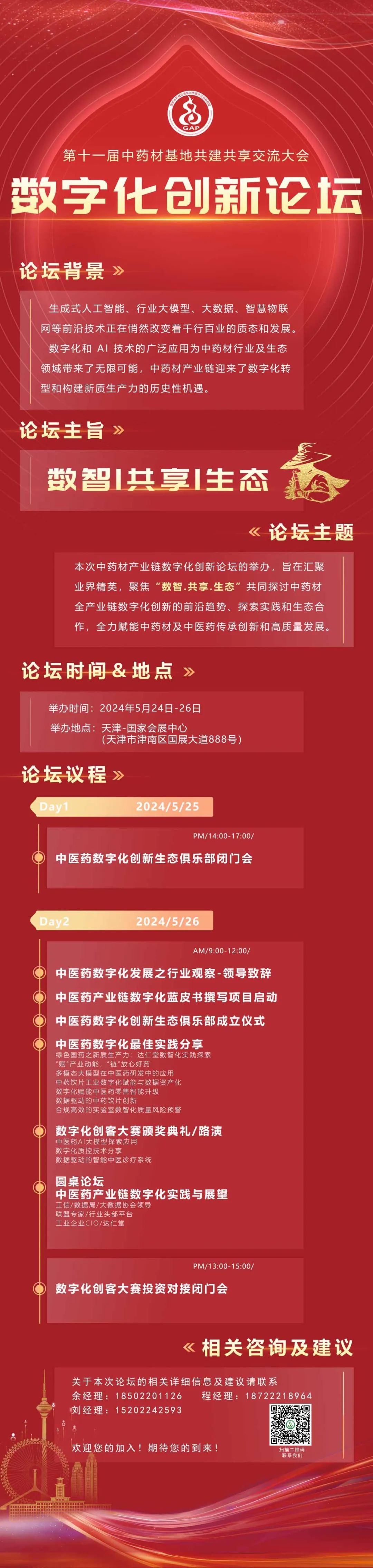 人工智能2.0和大数据时代,如何用新技术更好地赋能中医药?如何以新质生产力引领中医药高质量发展?这是我们在新时代下必须面对和解决的重要课题。为此,联盟在5月24-26日于天津举办的第十一届中药材基地共建共享交流大会上设置“中医药产业链数字化创新”平行论坛,本次论坛将邀请工信局、数据局、科技局等相关主管领导和行业协会领导,产业链各赛道领军代表,腾讯健康等互联网大厂以及优秀初创企业参与,一起洞察行业前沿趋势、分享创新实践经验,探索生态合作的机会。