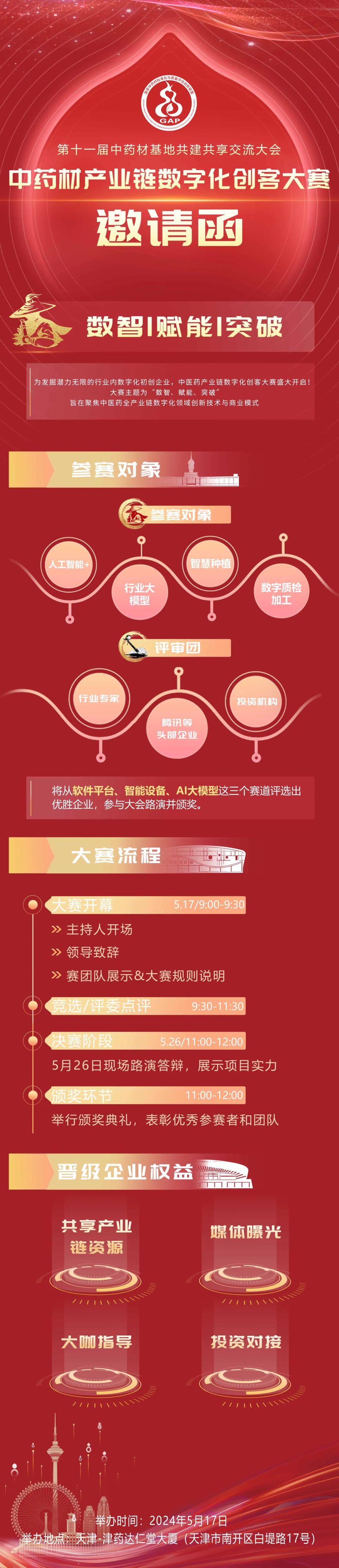承办方津药达仁堂作为一家拥有五百年悠久历史的中医药企业,不仅承载着深厚的中医药文化底蕴,也肩负着推动中医药现代化的重要使命。如今,科创环境日益优化,孵化了不少专注于中医药产业的科创企业。5月17日,津药达仁堂将在大会前组织承办行业数智化创客大赛,设置了中医药AI大模型、智能设备、软件平台三个赛道,为初创企业提供展示平台和发展机遇。获胜的创新项目将有机会获得资本投资,并获得大会媒体矩阵的宣传机会。同时,大赛还将为参赛企业提供技术支持、市场资源等方面的支持,助力企业的发展壮大。